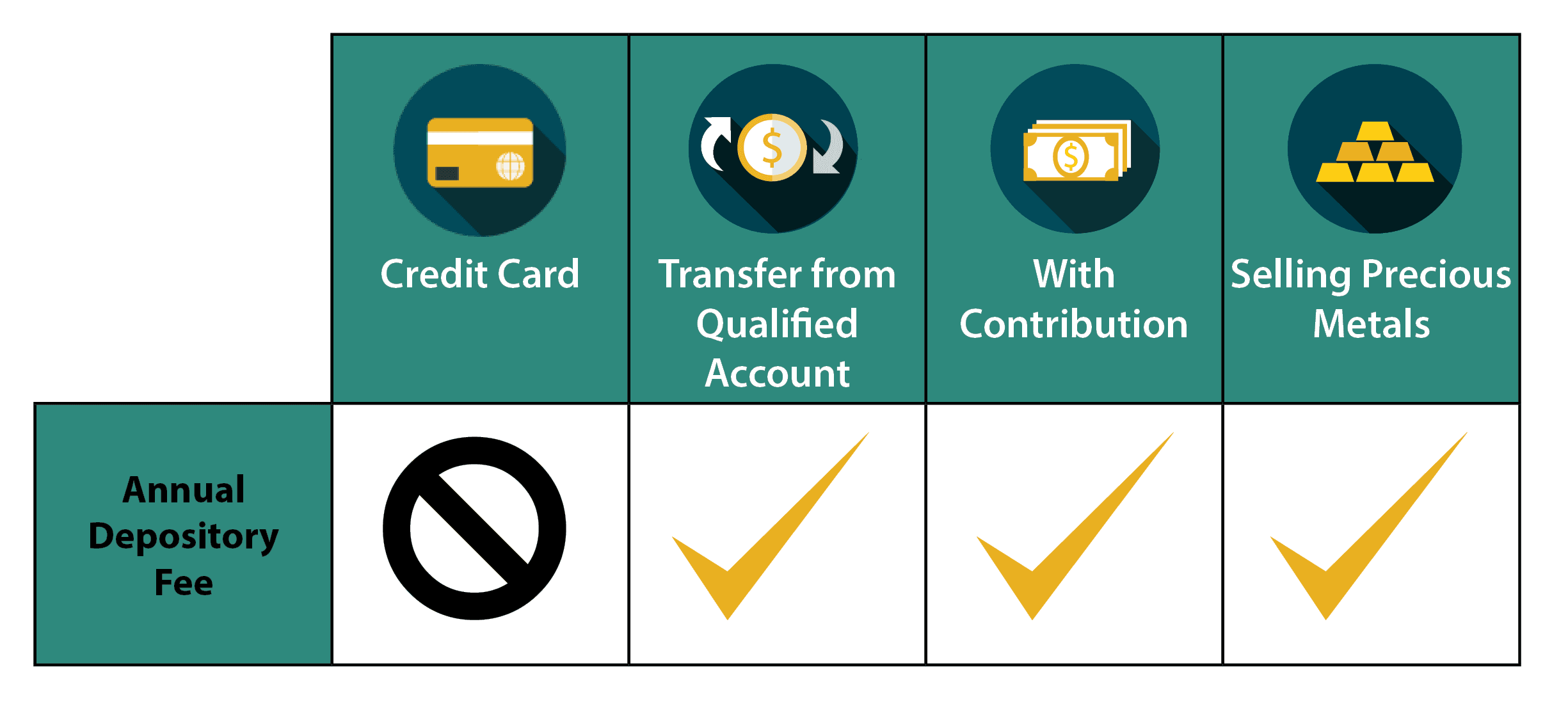 The storage of your precious metals investment at a depository will also incur a separate fee. Custodians and depositories work independently of each other and have separate fees for their services. Most storage facilities provide an invoice to the custodian annually while others bill quarterly. Since the cost of storage is a direct an expense associated with the investment the fee must be paid from qualified funds; this means that you cannot use a credit card or pay the depository directly.